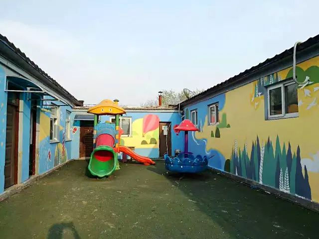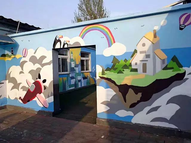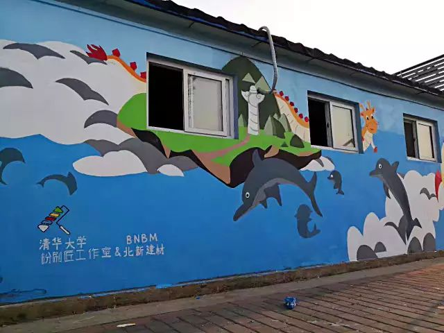 幼儿园位于校园的东北角,园内光线一般,需要一些更有活力的颜色来营造一种富有童趣和想象力的环境。志愿者们以大海和星空为主题,在墙面上点缀了各式风物,有海岸、雪国、故乡,白鹿、白鸟、蓝鲸、北极生灵,排舟、灯塔、热气球、小飞机等系列组图,与日月星辰一同,构成靓丽的大自然和快乐的动物精灵画面,希望给孩子们打造一片丰富多彩的世界。