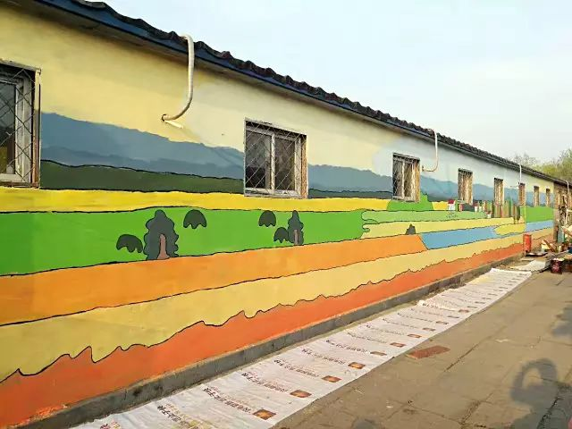 由于校门紧邻一个旧货市场,整体颜色黯淡,缺乏活力,所以志愿者们选取了富有张力的颜色去描绘金秋时节的原野。于是,钢筋水泥的城市中难见的那一望无垠的田野风光便跃然墙上。让孩子们去拥抱田野,让他们率真的笑容在田野里绽放。