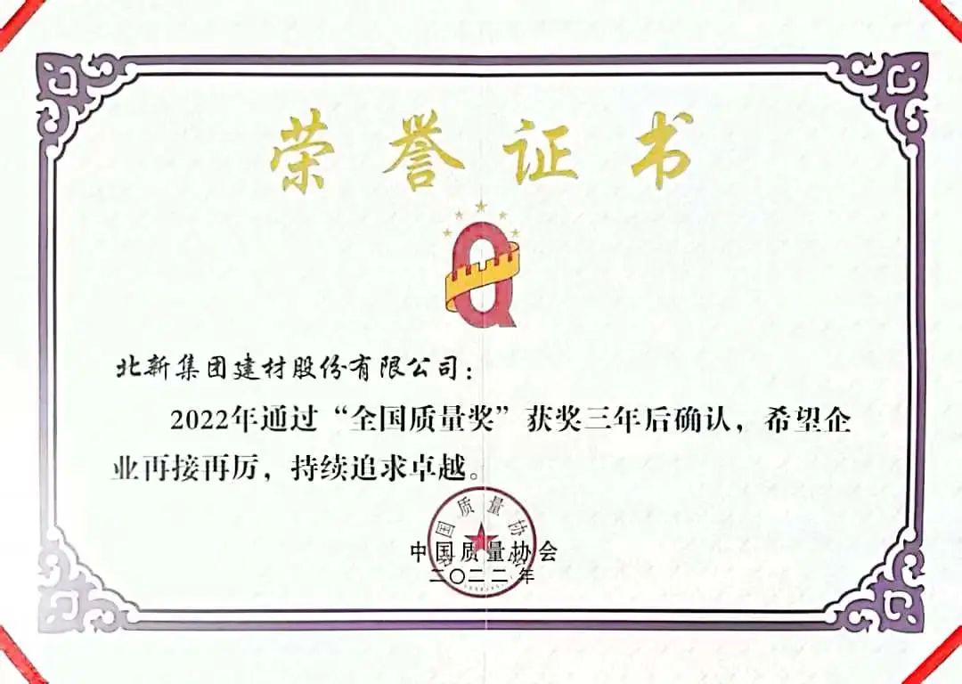 12月9日,主题为“共创高质量发展新未来:新领域、新要素、新实践”的2022中国质量协会年会在北京召开。大会发布了第十八届全国质量奖企业通过确认组织名单,北新建材顺利通过获奖三年后的确认评审。