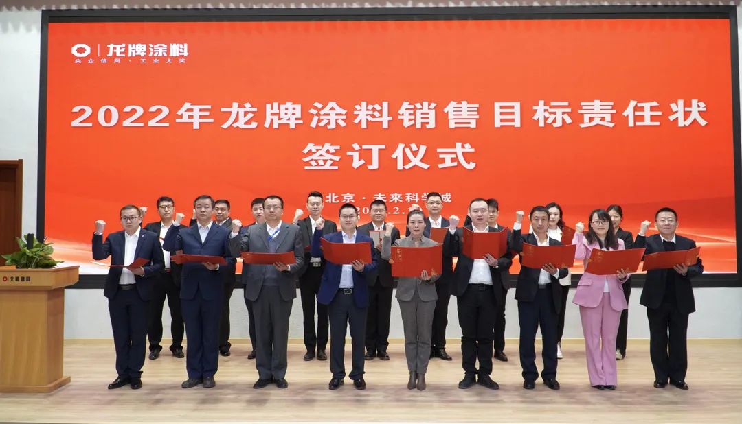 同期,龙牌涂料举行了2022年营销系统销售目标责任状签订仪式。唐智谋分别与经销商代表河南工辅袋鼠供应链有限公司、校之宝(北京)科技有限公司签订2022年度经销协议,与北京大区、天津大区、河北大区、山东大区、河南大区、山西内蒙大区、华南大区、华中大区,战略客户及协同业务部负责人签订了2022年度销售目标责任状,大家在陈燕的带领下一起宣读铿锵誓言。
